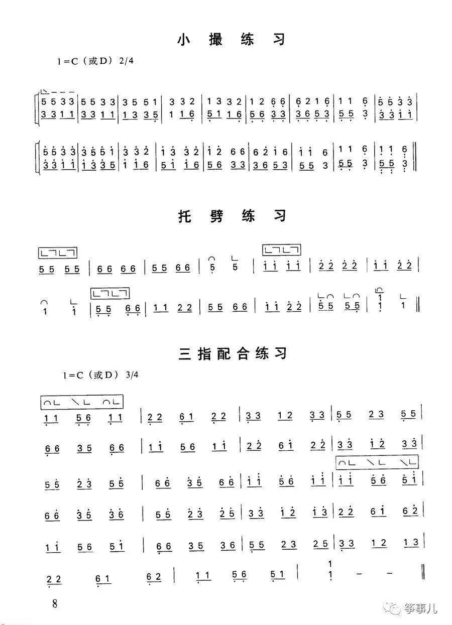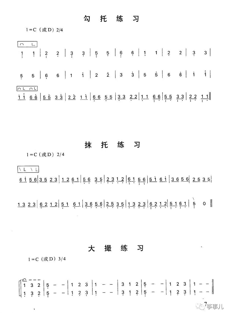 进行练习前,先端正好姿势,这是第一步。 首先左手应轻放在筝码左侧的弦面上,以保持肩膀平衡。然后,右手轻轻抬起,肩膀自然放松,大臂与小臂约成90°角,腕部与小臂保持水平状态,五指弯曲成拱形。这里,我们用gg1两弦(一个八度)作初步练习。 中指勾指法练习 将右手中指轻放在g弦(第十三弦)上方约1cm处,五指保持拱形,手腕轻轻向内一转,带动中指三个关节,在中指触弦的一瞬间用力,发出声音,手肘立刻带动手腕拾起,五指继续保持拱形状,力量消失,呈放松状态。 注意每次触弦要将精神集中在这一力点上,触弦后立刻放松,触弦要快。进行第二次练习时,一定要将前面的动作再准备好,记住慢、稳、松,切忌急,浮、紧。反复练习,达到肘腕和指关节能密切配合,完成拨弦发音这一过程为佳。 大指托指法练习 大指的拨弦前后要求与中指一样,但大指是向外拨弦,故将大指轻放在g弦(第八弦)上方约1cm处,五指保持挑形,手腕轻轻向外一转,带动大指小关节,在触弦一瞬间用力,发音后手时立刻带动手抬起,五指保持拱形,放松,如此反复练习。 勾托练习 大指与中指的配合练习叫勾托练习。练习时,先在gg!两弦上进行练习,要注意手指保持拱形,居中的食指自然微弯,不屈不扬,中指的勾指法和大指的托指法都要按45°角拨弦,拨弦后手抬起的位置应在gg4两弦上方的中间,这样中指触弦点,大指触弦点与抬手的位置正好构成一个正三角形,那么,发出来的音色将是最佳音色 抹托练习 食指的拨弦方法与中指基本相同,食指与大指的配合练习叫抹托练习。练习时,先在相邻的两根弦上进行练习,如g1和al弦,a弦和c2弦等要注意中指的位置不变,手型保持拱形,切忌将中指、无名指和小指收成握攀状。由于食指与大指是八度以内的配合,故手腕运用较多,同样要注意放松,抬手。 大撮指法练习 大指和中指同时弹奏高低八度的两个音,这种弹奏法叫大撮指法符号:L,练习大撮时,注意大,中指张开的距离(即一个八度),手型保持拱形,由手时带动手腕向上提,再由手腕带动手指关节,在抬起的同时用力一抓,使两个高低八度的音同时发出.弹奏后注意手自然抬起、放松,保持手型不变。 小撮指法练习 大指与食指按一定的和声关系同时弹奏两个音,这种弹奏法叫小撮,指法符号:,弹奏时,注意手腕放松,通过手腕带动大、食指各小关节,触弦后手往上提,保持拱形大指托劈指法练习。大指保持托指法的姿势,通过手腕带动大指小关节先后向外,内拨弦,这种弹奏法叫托劈,练习时要求:手腕放松,五指保持拱形,拨弦的角度,力点的要求与托指法同。 三指配合练习 将大,中指的配合和大,食指的配合结合在一起的练习,叫三指配合练习。练习时,注意:1、拨弦的角度;2.每根于指拨弦后的放松和拱形手型的保持。3.注意抬手,手腕放松;4.注意勾托和托抹各自的音高关系 通过勾托练习,抹托练习,大练与,小撮练习,托劈练习和三指配合练习,要求掌握:1、正确的手形一拱形;正确的姿势一全身自然放松,2.大、中指,大,食指的配合,于蜿的灵活转动,拨弦的角度。