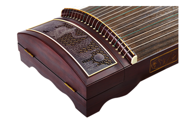 选用上乘的质地坚硬的缅甸红木为主体,以木质柔韧的薄板镂空成各种传统四方连续图案,其间采用银丝工艺镶嵌,工艺精湛,线条秀丽优美,如流水游云,显得温文尔雅。代表作品《双鹤朝阳》、《西施浣纱》等。此筝自然制作周期为240天左右。