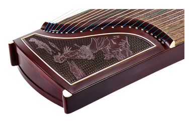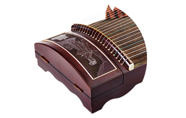 选用上乘的质地坚硬的缅甸红木为主体,以木质柔韧的薄板镂空成各种传统四方连续图案,其间采用银丝工艺镶嵌,工艺精湛,线条秀丽优美,如流水游云,显得温文尔雅。代表作品《双鹤朝阳》、《西施浣纱》等。此筝自然制作周期为240天左右。